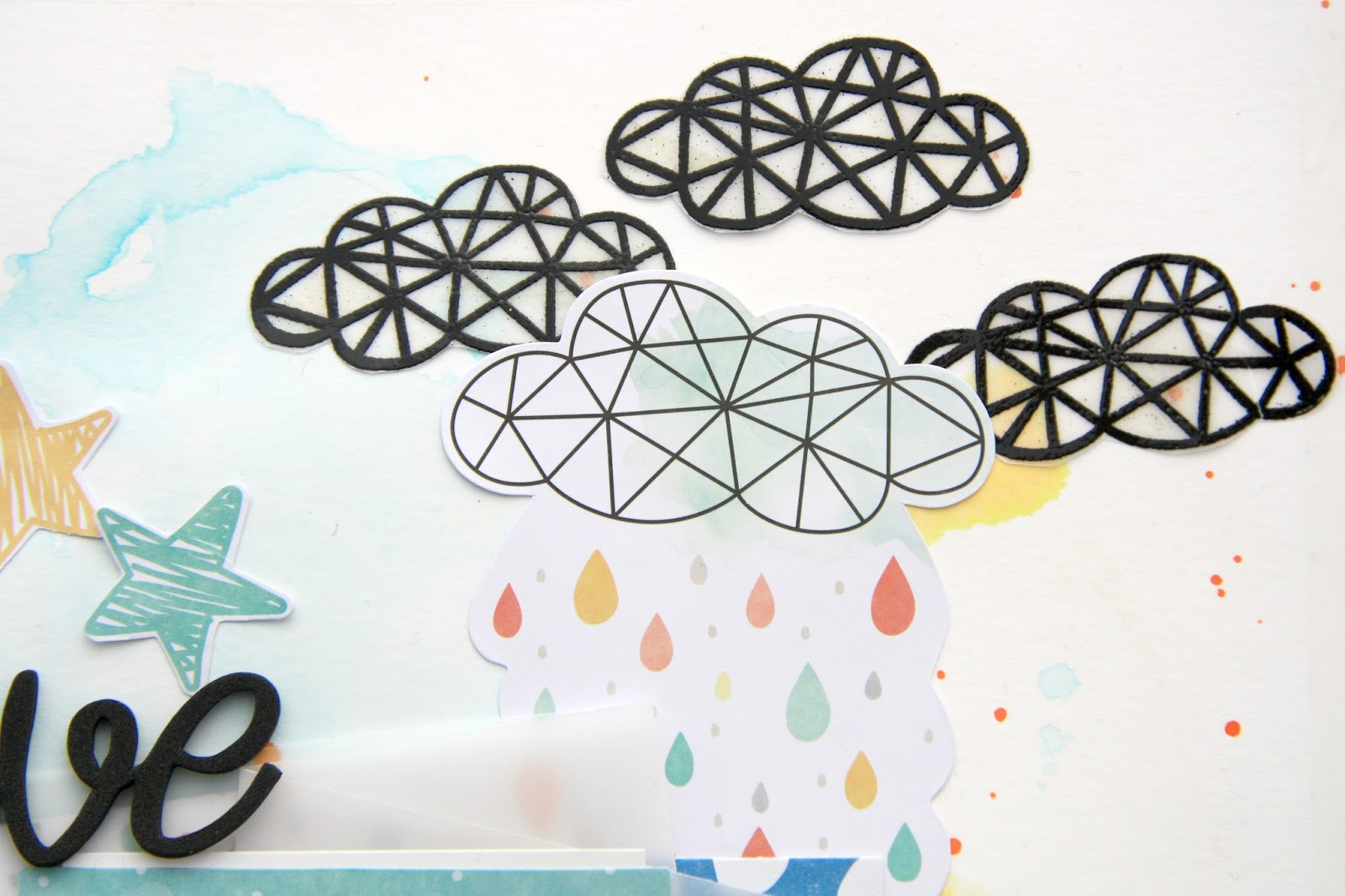 Os dejo con algunos detallitos más de cerca para que podáis ver la chapita, las palabras de foam,.. las nubes hechas con embossing sobre vellum con los sellitos... Ah, para quien le pueda interesar el fondo está hecho con acuarelas, las Peerless.
